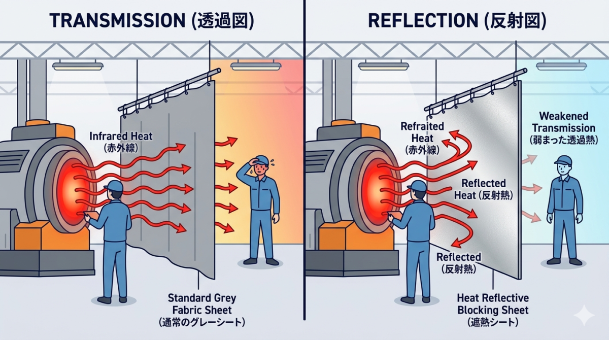 たとえ耐熱温度が300℃あるシートであっても、それが「遮熱性能」を持っていない場合、熱(赤外線)はシートを透過して反対側に伝わってしまいます。「シートは無事なのに、反対側に置いてある機械が熱で止まった」という失敗は、この機能の混同が原因です。